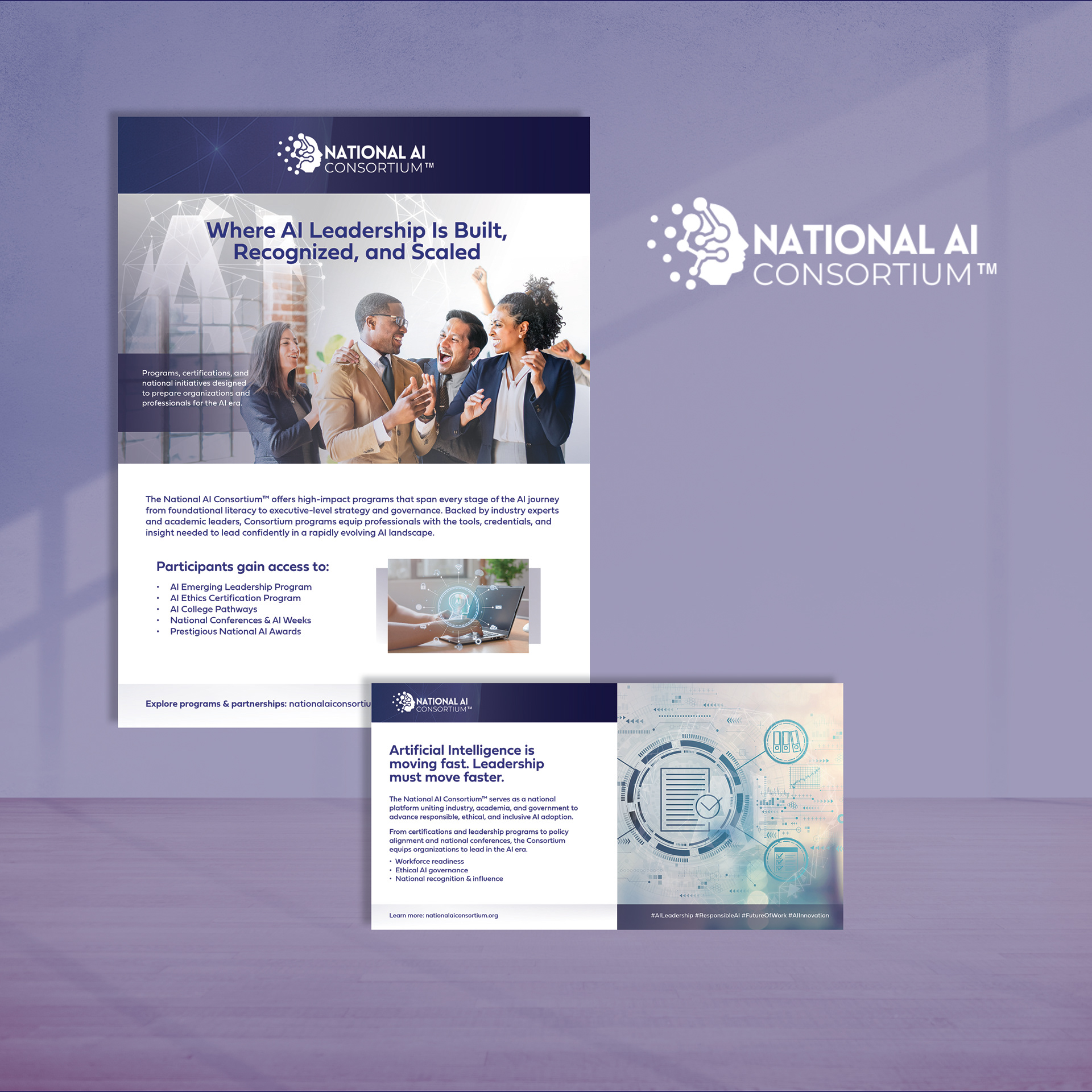 This project involved shaping cohesive marketing materials that position the National AI Consortium as a credible, national authority at the intersection of industry, academia, and government. Visual hierarchy, tone, and messaging were intentionally structured to support executive audiences, communicate complex offerings with clarity, and maintain consistency across campaign touchpoints while aligning with the Consortium’s long-term leadership and policy mission.